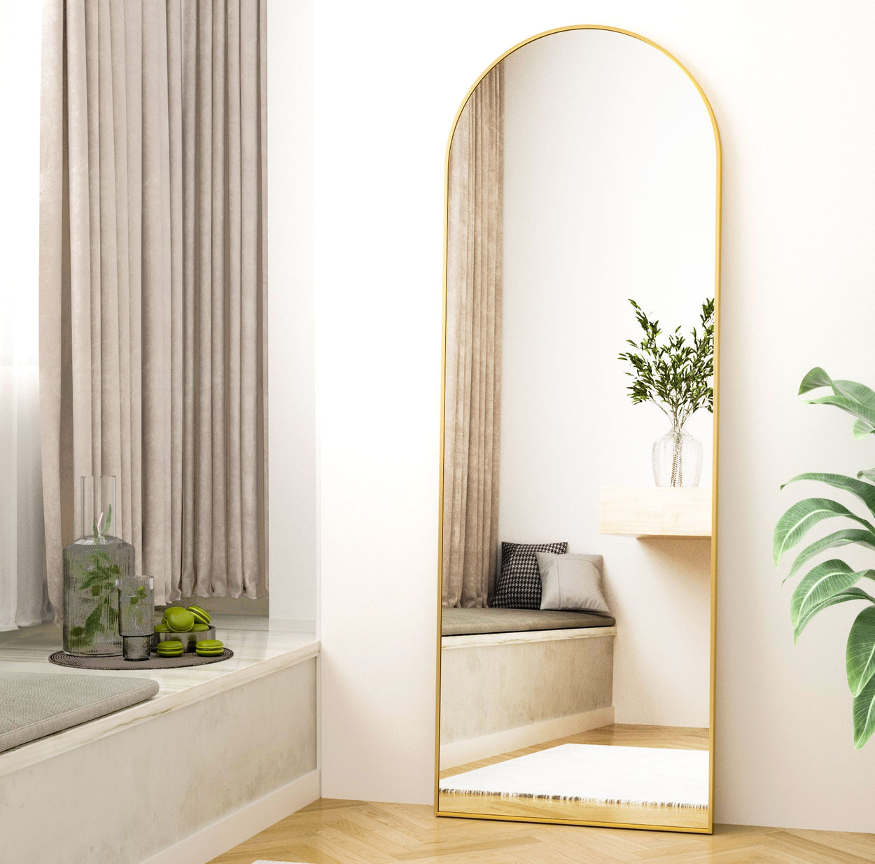 - Unique Design: The top of the floor mirror is designed with a unique smooth arched-top frame, which especially attracts people's attention and highlights the beauty of the mirror. The thin aluminum alloy frame makes the mirror looks more classic and it is suitable for dressing in any room