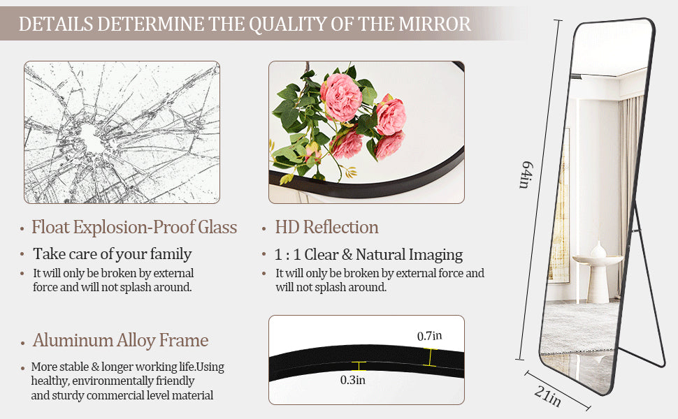 - Glass and Mirror - This full body mirror is assembled with a HD high transparent explosion-proof float glass for sturdy and durable use; this shatter-proof glass holds high definition reflection with non-distortion
