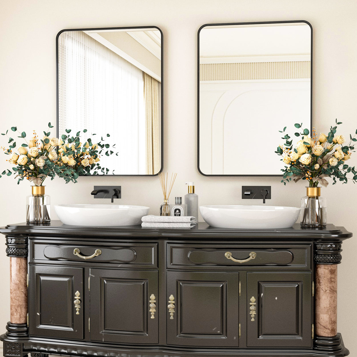 - Safe and Beautiful - Shatter-proof membrane, scatter prevention, keep you and your family safe enough. Square Mirror features an aluminum alloy frame, durable and fadeless. The rectangle black stainless steel frame would protect the mirror also adds elegance and class for bathroom and bring simple sophistication to any room